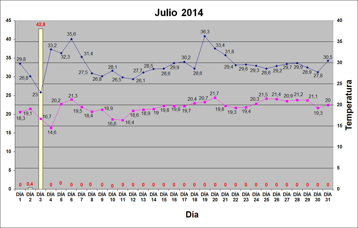| Julio 2014 | MÁXIMA (ºC) | MÍNIMA (ºC) | LLUVIA (l/m2) | ||